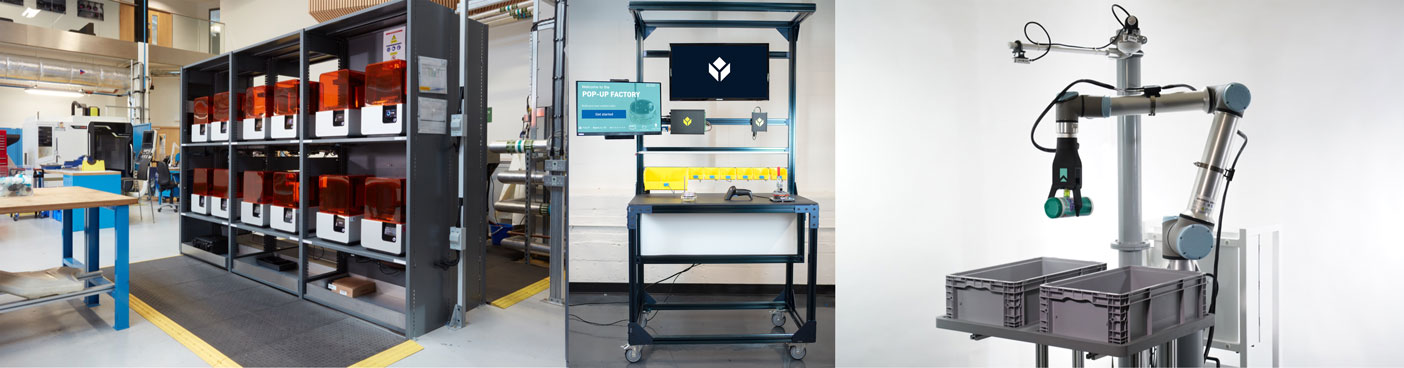 The pop-up factory is a collaborative effort between several companies at the forefront of digital manufacturing. The entire production was designed and run with Tulip’s app platform, which guides the workflows and collects real-time data of the production line. Powerful Formlabs SLA 3D printers fabricate mass-customized parts. The assembly line itself is powered by Vention’s customized workstations. RightHand Robotics is providing an intelligent automation solution for the packing station. Finally, the entire factory is made possible by AWS’s cloud infrastructure powering the backend.
